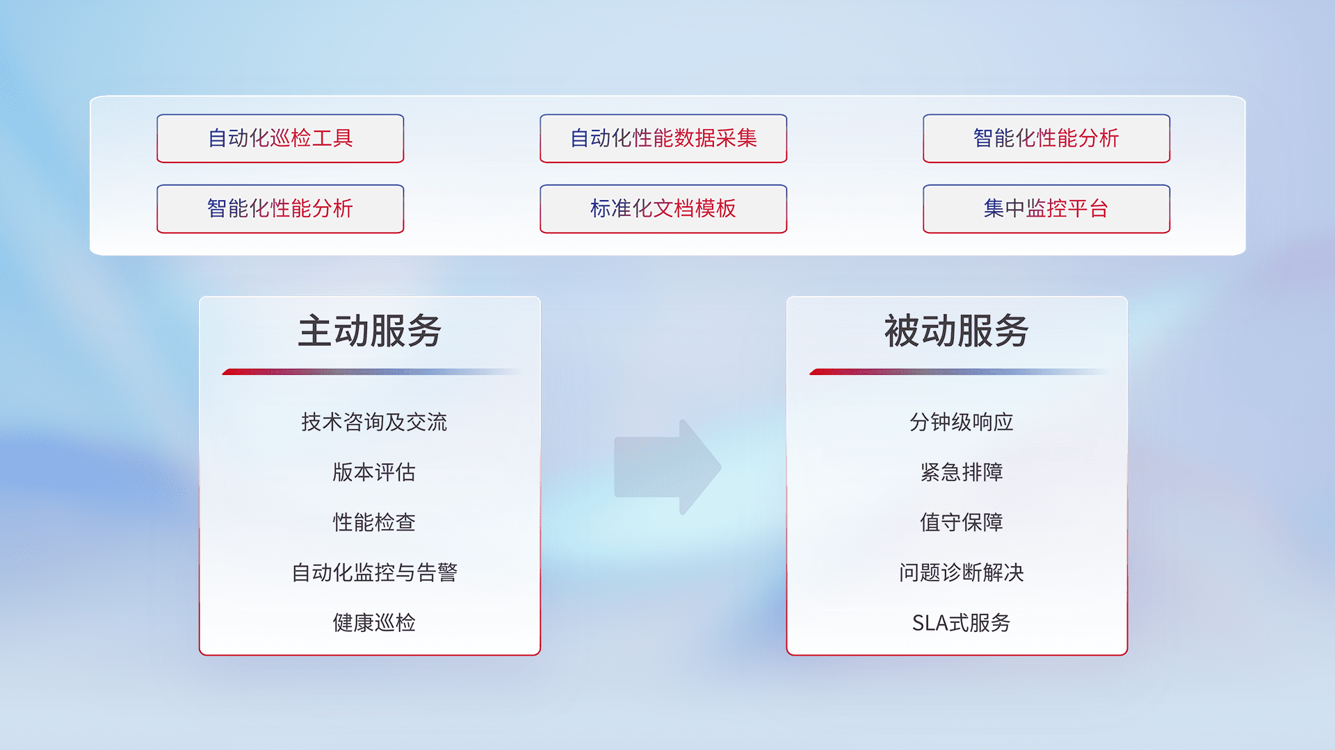 智能化工具和标准化文档,,保障服务质量,,,提供主动服务(包含技术咨询、、、、版本评估、、、、性能检查、、、自动化监控与告警、、、健康巡检)和被动服务包含(分钟级响应、、紧急排障、、值守保障、、、问题诊断解决、、、SLA服务)。。。。